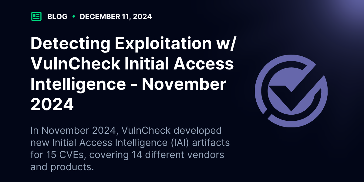In November 2024, VulnCheck released Initial Access Intelligence (IAI) artifacts for 15 CVEs, covering 14 different vendors and products. 11 of the 14 have confirmed exploitation activity as of December 11th, 2024. The release of these detection artifacts include widely used edge devices from vendors including Palo Alto, Citrix, D-Link, Fortinet and Netgear.