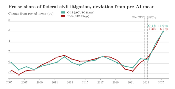 “This stability seems to reflect a structural barrier: for most people, self-representation is prohibitively hard,” the paper says. “Filing a federal civil complaint requires identifying the correct jurisdictional basis, pleading sufficient facts to survive a motion to dismiss, and navigating procedural requirements that vary by context and case type. The widespread, public diffusion of capable LLMs changes that calculus. Without a law degree and at de minimis cost, any person with an internet connection can not only obtain interactive, case-specific legal guidance—drafting complaints, identifying statutes, navigating procedure—but also generate passable legal documents, particularly so after the release of GPT-4 in March 2023.”
