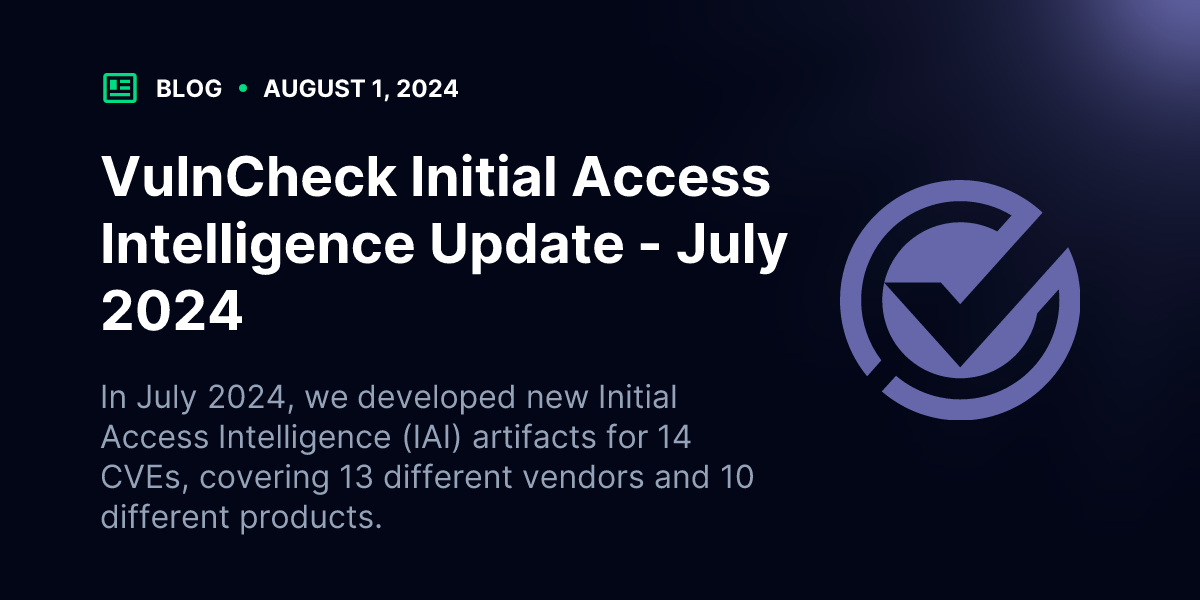 In July 2024, VulnCheck crossed 250+ Initial Access Intelligence (IAI) artifacts, developing artifacts for 14 CVEs, covering 13 different vendors and 10 different products.