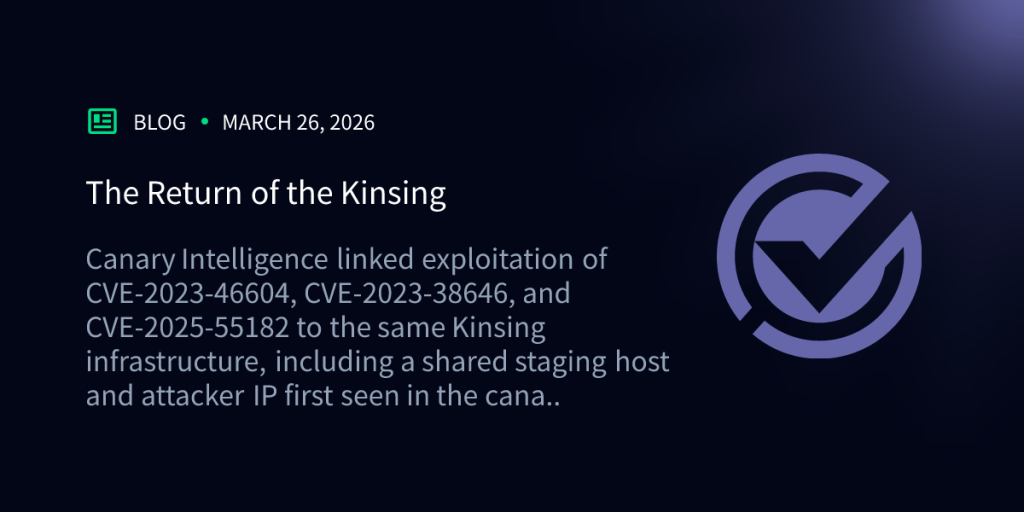This is exactly the kind of clustering Canary Intelligence is good at surfacing. Exploitation of CVE-2023-46604, CVE-2023-38646, and CVE-2025-55182 all led back to the same infrastructure. If nothing else, it is a reminder that older malware families do not need new binaries to stay relevant. Sometimes they just need one more CVE.