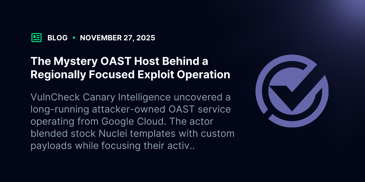 VulnCheck’s research team tracks attacker infrastructure and exploit activity using our Canary Intelligence and IP Intelligence datasets. Investigations like this one into attacker-run OAST services and structured scanning workflows are part of our ongoing effort to highlight real-world exploitation trends. For more research like this check out our blogs, XWiki Under Increased Attack and ICTBroadcast Command Injection Actively Exploited (CVE-2025-2611).