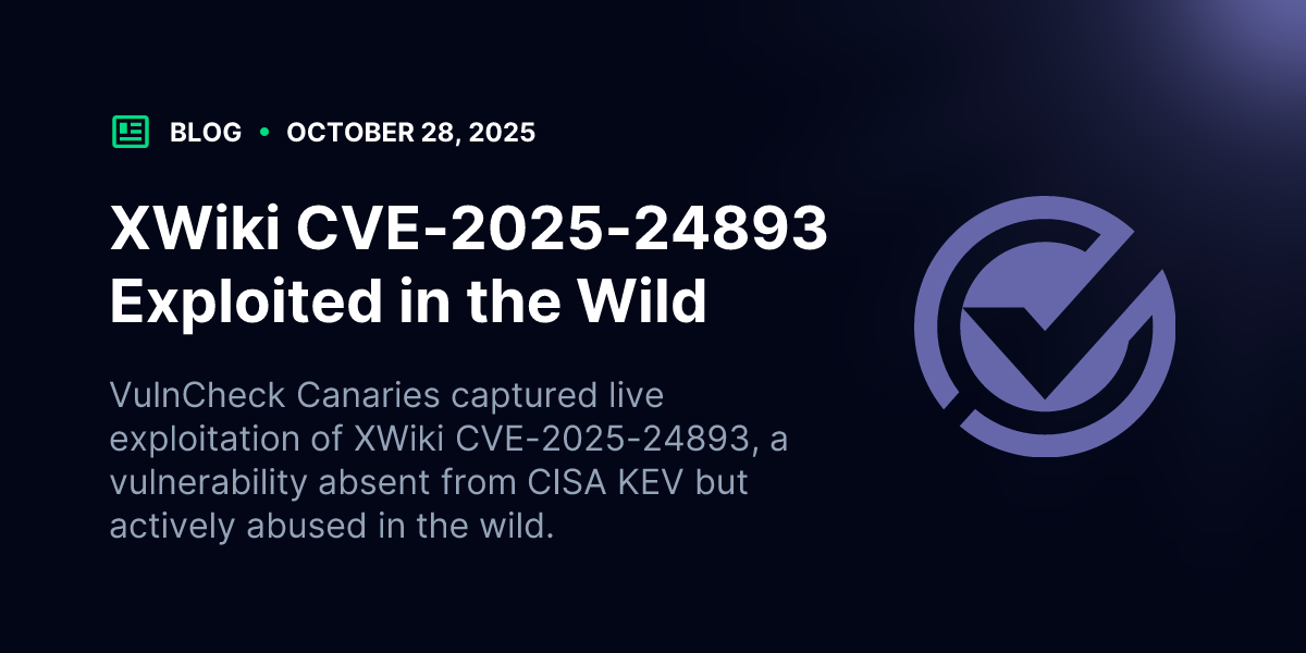 CVE-2025-24893 is an unauthenticated, remote template-injection vulnerability in XWiki that is being actively exploited in the wild. It does not appear in CISA KEV. Public reporting from Cyble, Shadow Server, and CrowdSec prompted us to add the vulnerability to VulnCheck KEV in March 2025, but those reports only indicate exploit attempts. Our VulnCheck Canaries observed a two-stage exploit chain and associated indicators. Below are the technical details.