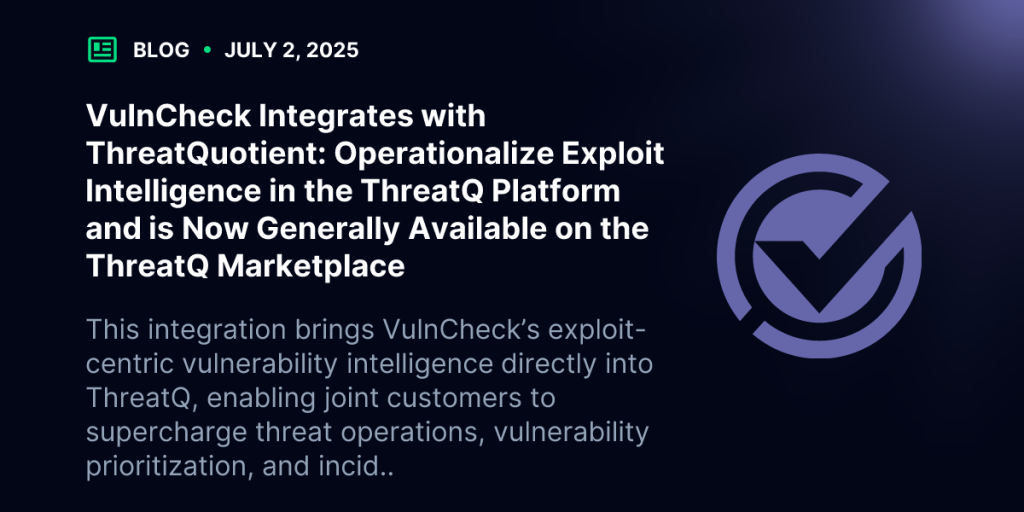 VulnCheck is excited to announce its integration with ThreatQuotient’s ThreatQ Platform — now generally available in the ThreatQ Marketplace. This integration brings VulnCheck’s exploit-centric vulnerability intelligence directly into ThreatQ, enabling joint customers to supercharge threat operations, vulnerability prioritization, and incident response with real-world exploit data.
